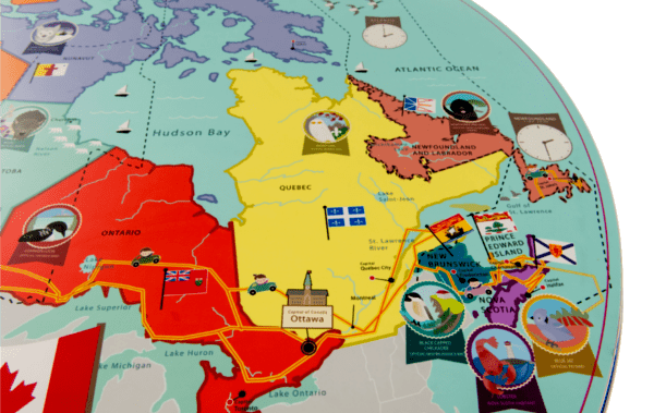 Features important information such as Provincial Boundaries, National Boundaries, Provincial Animals, Bilingual National Anthem, Main Highways, National Symbols, Mountains, Rivers, Lakes, Oceans, Provincial Flags, Provincial Symbols, Time Zones and Mountain Heights